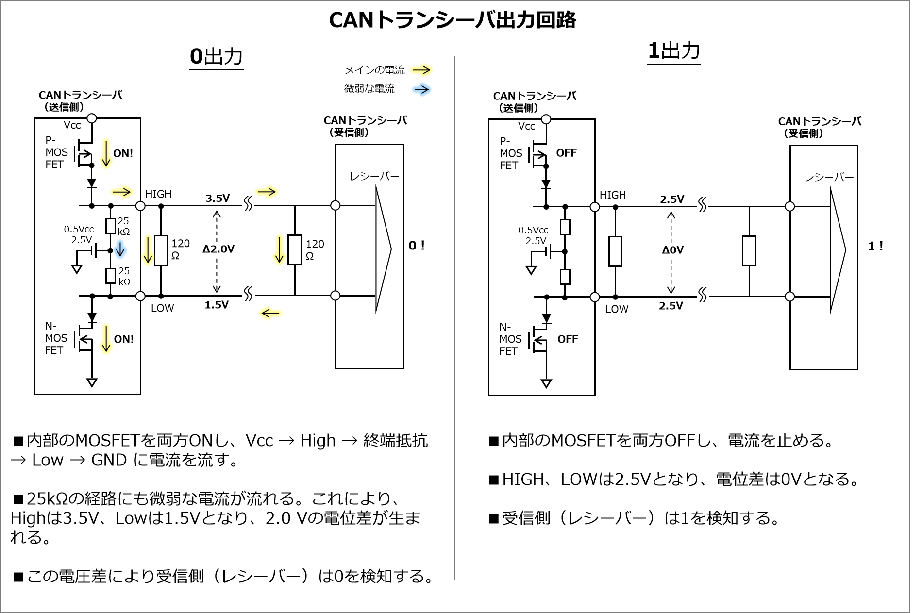 各ノード内にはCANコントローラ、トランシーバがあり、 HIGH/LOWの入出力を行っています。終端抵抗の必要性とも関係するので解説します。