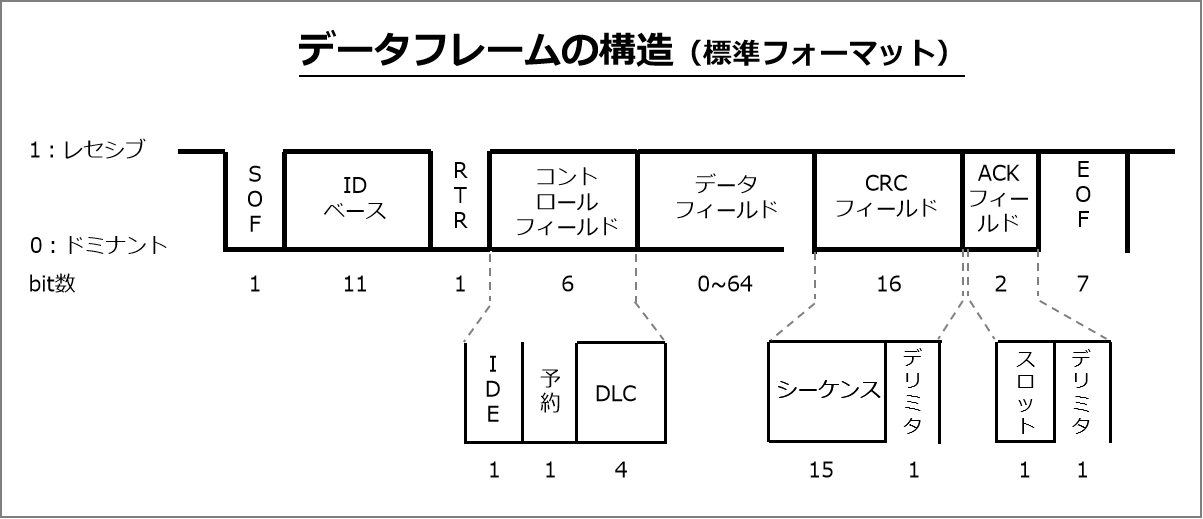 この仕組みをアービトレーション(通信調停)といい、0はドミナント(優性)、1はレセシブ(劣性)と言います。ドミナント/レセシブは後述のACKフィールドでも使われます。