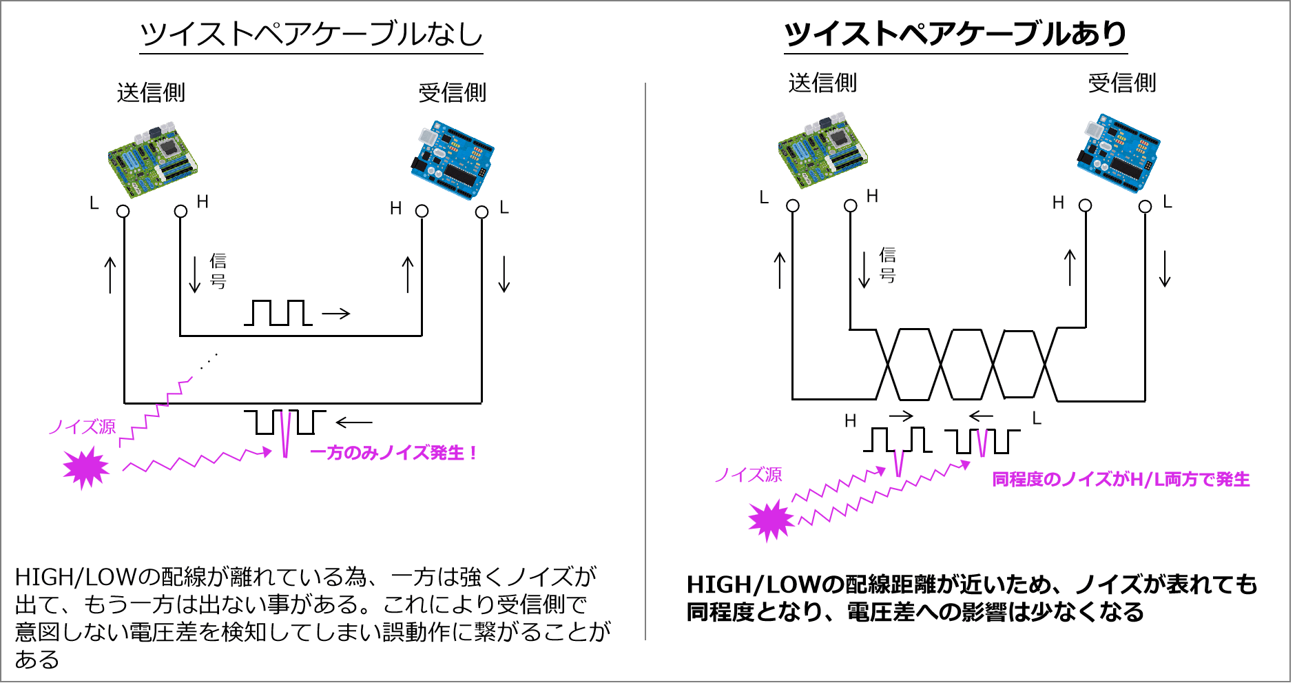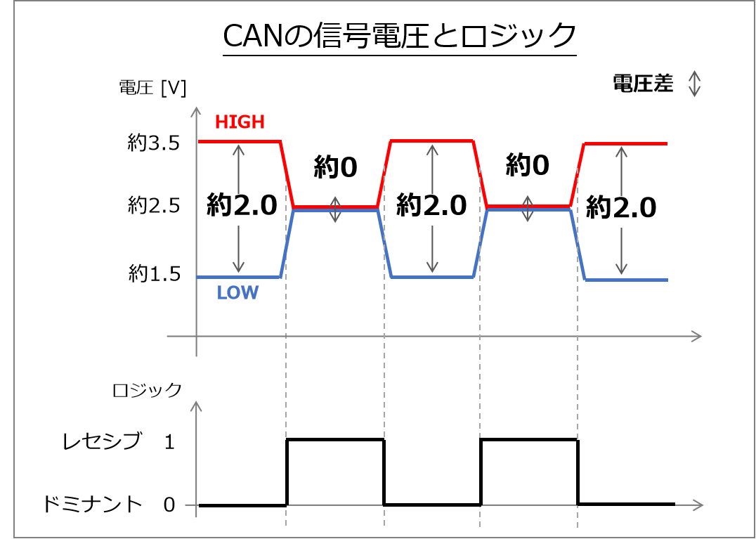 シングルエンドは信号線が1本で済むメリットがありますが、ノイズが入った時に0を1(もしくはその逆)と誤認識してしまう恐れがあります。対して差動信号は信号線は2本いるものの、電圧差を見ている関係上、ノイズによる影響が少ないメリットがあります。CANは差動になります。