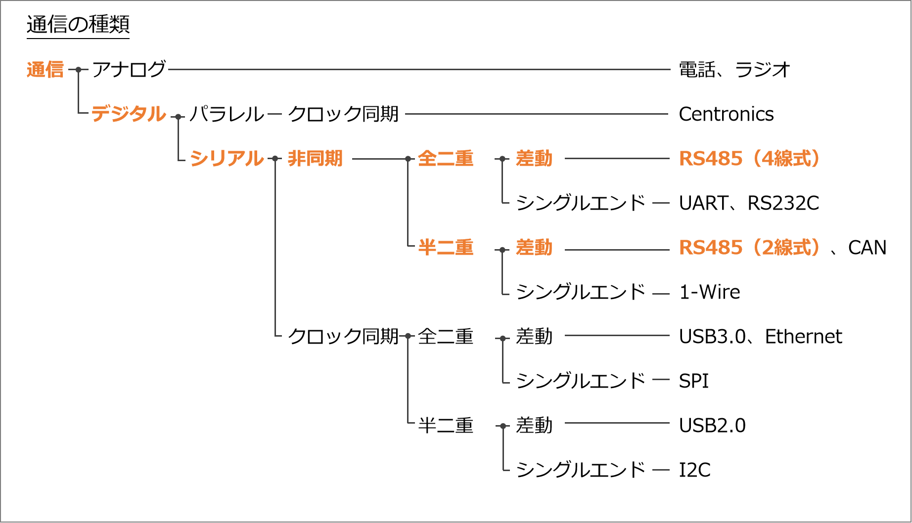 | 終端抵抗 | 不要 | 必要 終端(受信側)1か所 | 必要 2線式:両端2か所 4線式:両端4か所 |
