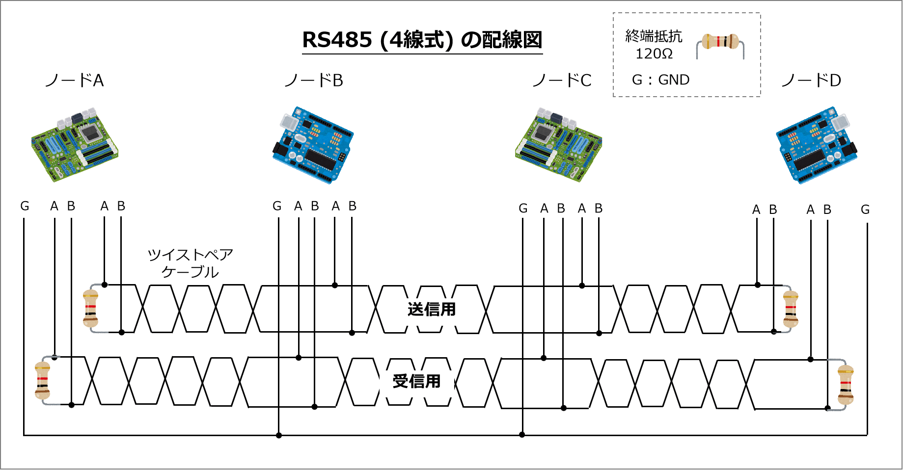 信号線A、Bはツイストペアケーブル(2本の電線をより合わせたもの)にした方が良いです。