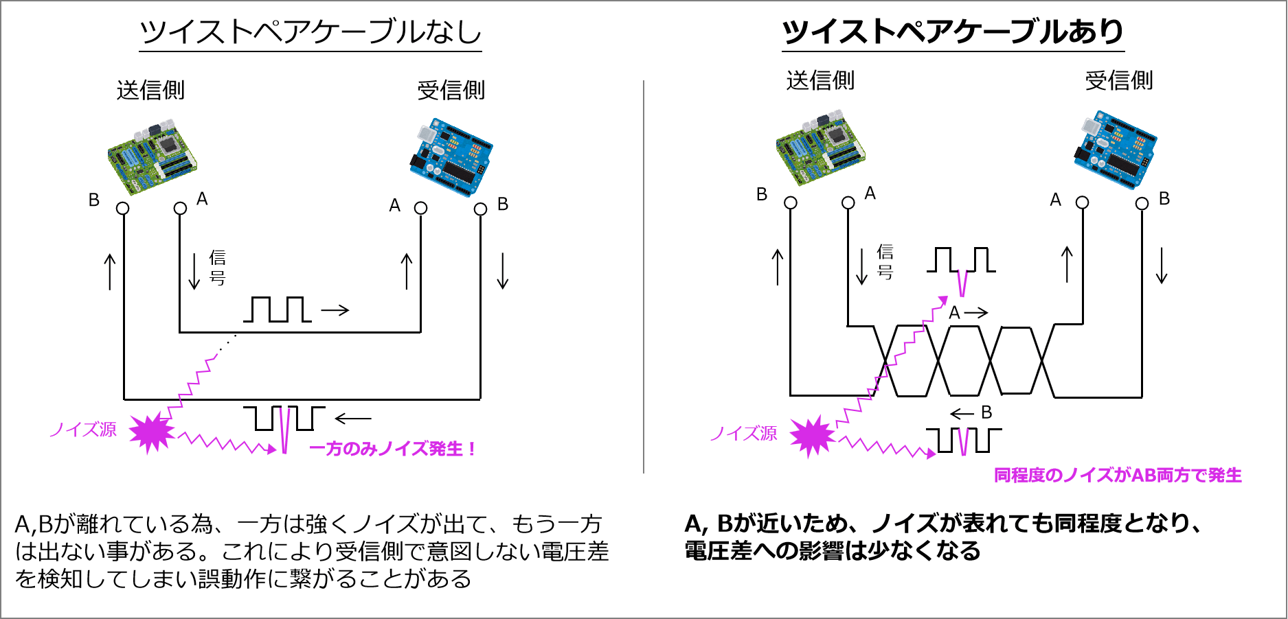 RS485は差動信号の為ノイズには強いのですが、信号線が離れていると、一方は強くノイズが出て、もう一方は出ない事があります。そうすると、受信側で意図しない電圧差を検知してしまい誤動作に繋がります。ツイストペアにする事で信号線間の配線距離が近いため、同じようにノイズが表れ、結果電圧差への影響が少なくなります。