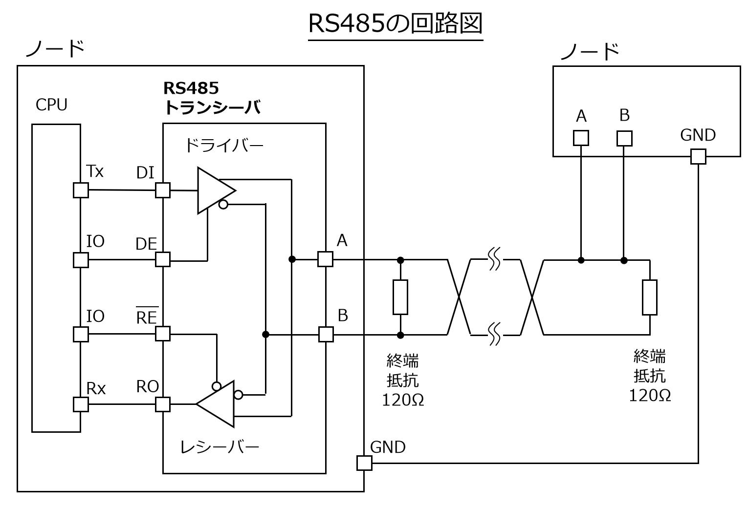 RS485には2線式と4線式、2種類の配線があります。その名の通り、ノード同士を2本の電線で結ぶ方式を2線式、4本で結ぶ方式を4線式と言います。